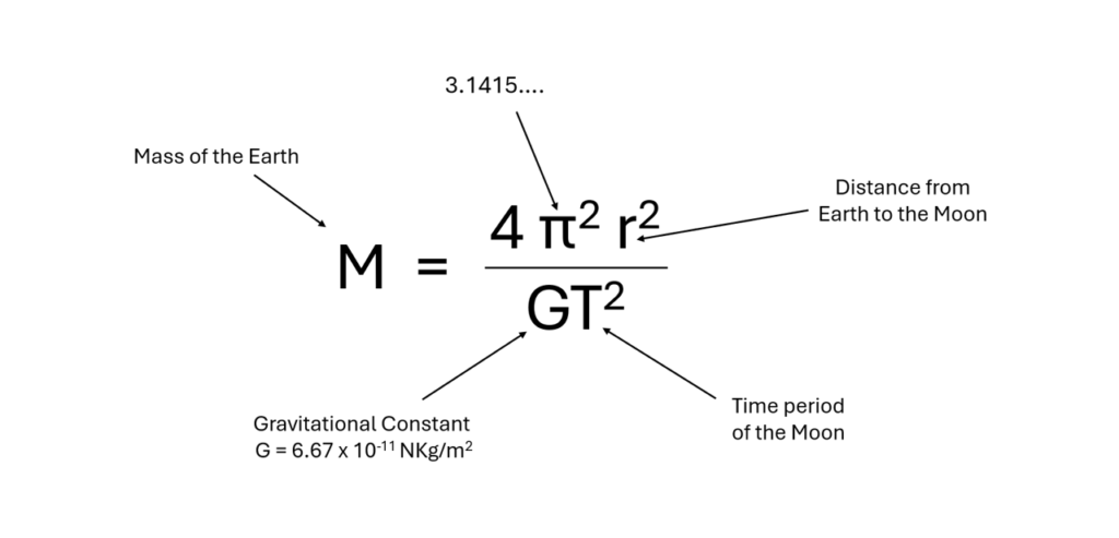 Cavendish’s experiment was incredibly delicate and complex, even by modern standards. But today, if we accept the value of G that he measured, we can use a much simpler method to verify Earth’s mass. We can do this by studying the Moon’s time period and its distance from the Earth. Applying Kepler’s Third Law and Newton’s Law of Universal Gravitation, along with the Moon’s orbital distance and its sidereal period of 27.3 days, we can arrive at a very accurate estimate of Earth’s mass using the equation: